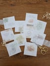 Es sind 20 Karten (von beiden Sets alle Karten). Jede Karte ist 10x10cm groß, sodass sie die perfekte Größe haben, um sie jederzeit bei sich zu tragen oder sie in den Geburtsraum aufzuhängen.