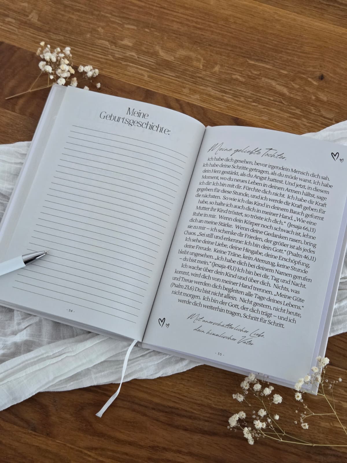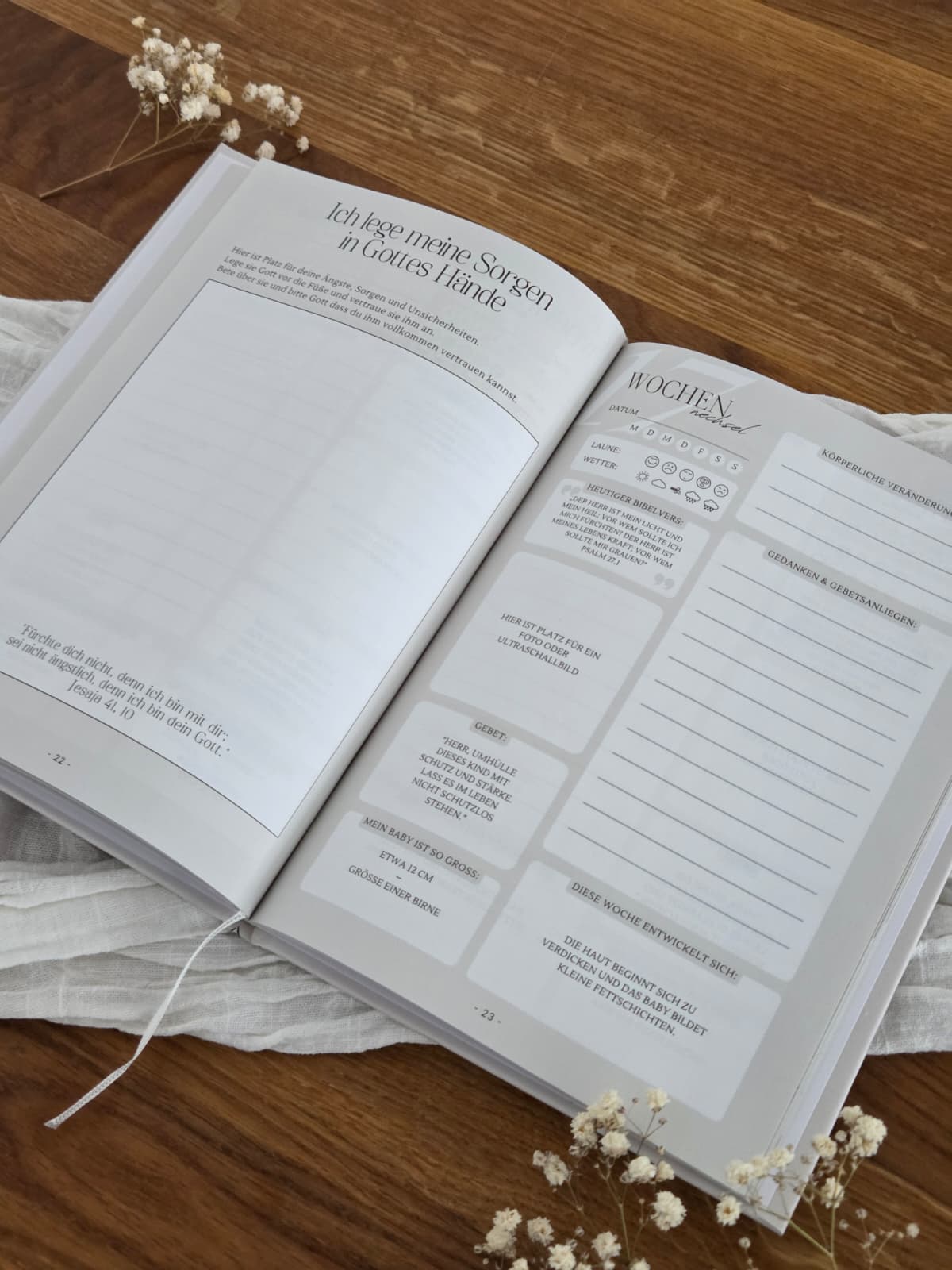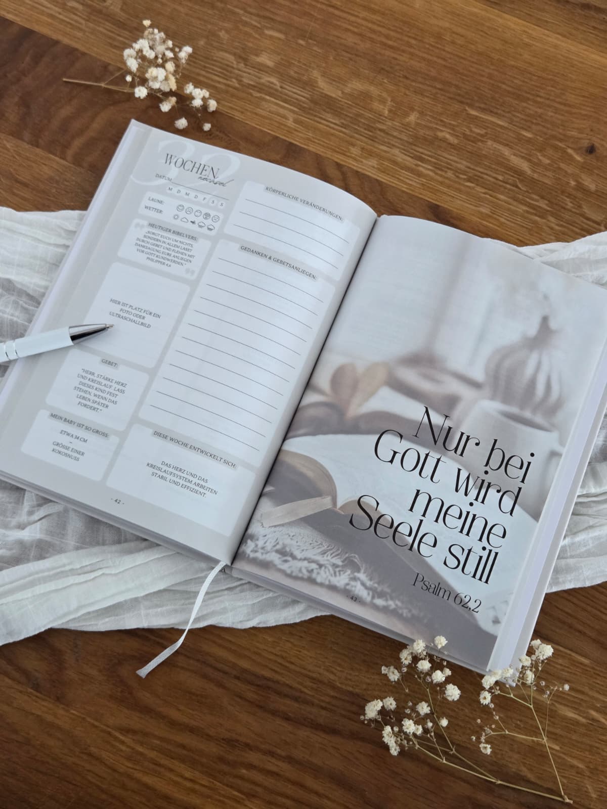 Dieses Tagebuch begleitet dich bewusst durch deine Schwangerschaft – Woche für Woche, gemeinsam mit Gott. Es verbindet Raum für deine persönlichen Gedanken mit geistlicher Tiefe, biblischer Ermutigung und Wissen über die Entwicklung deines Babys.