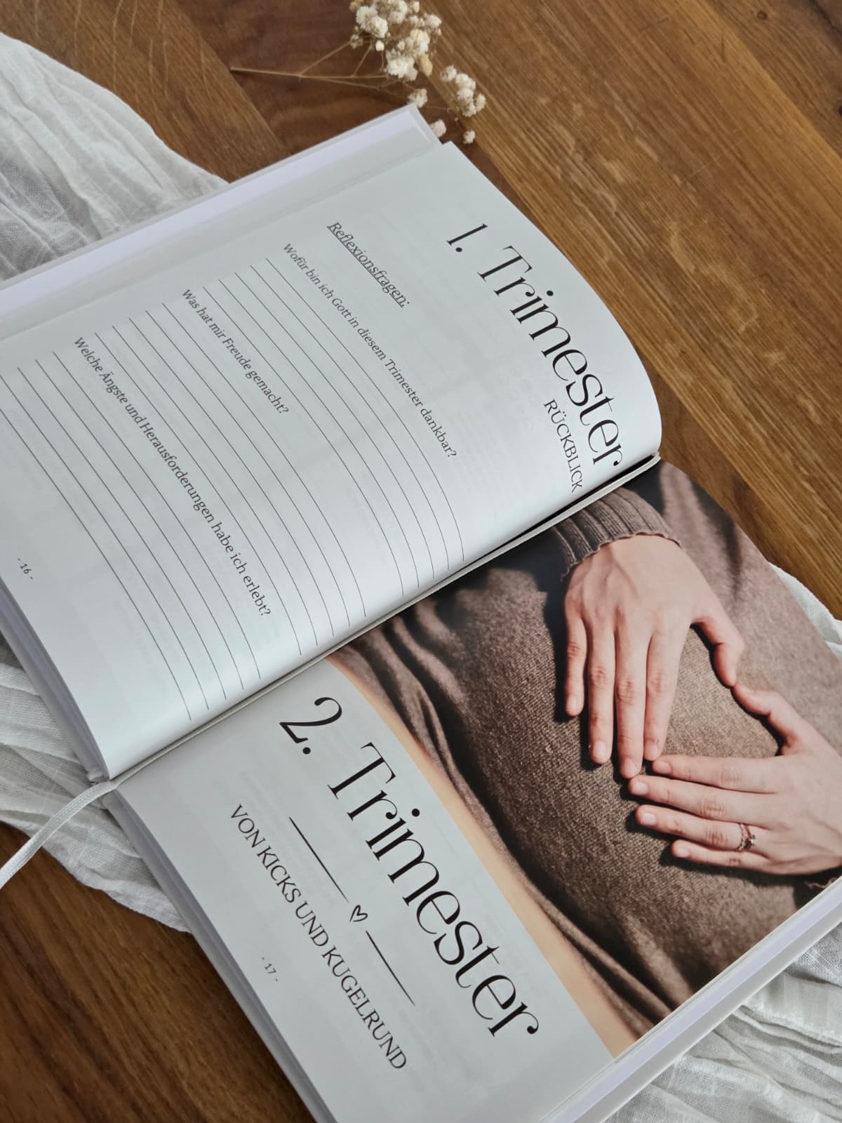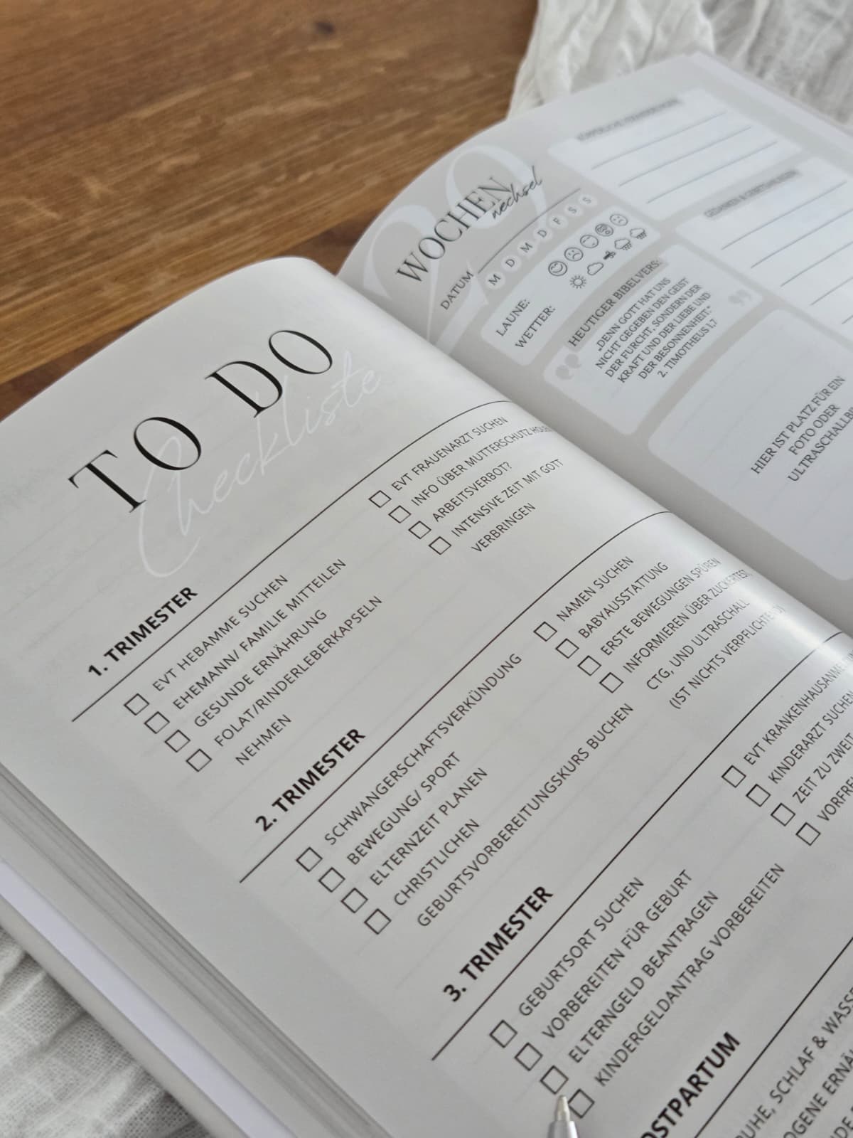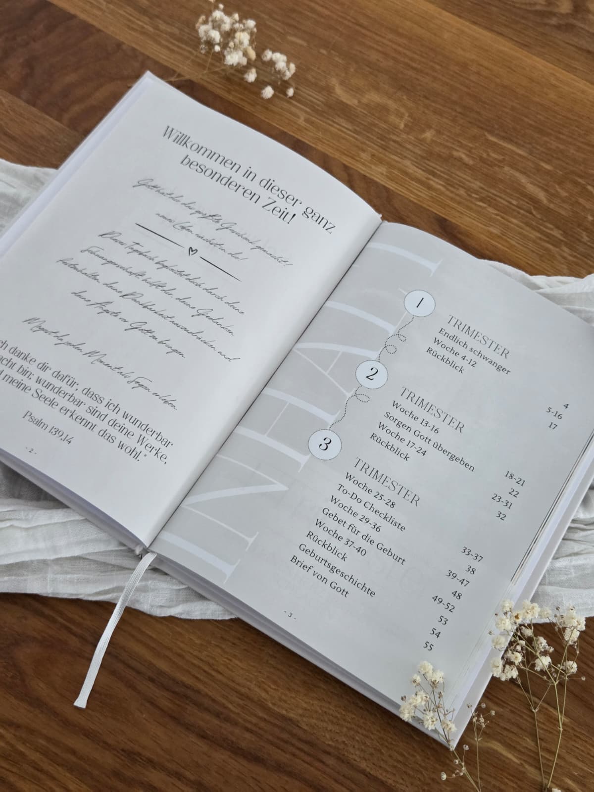 Dieses Tagebuch begleitet dich bewusst durch deine Schwangerschaft – Woche für Woche, gemeinsam mit Gott. Es verbindet Raum für deine persönlichen Gedanken mit geistlicher Tiefe, biblischer Ermutigung und Wissen über die Entwicklung deines Babys.